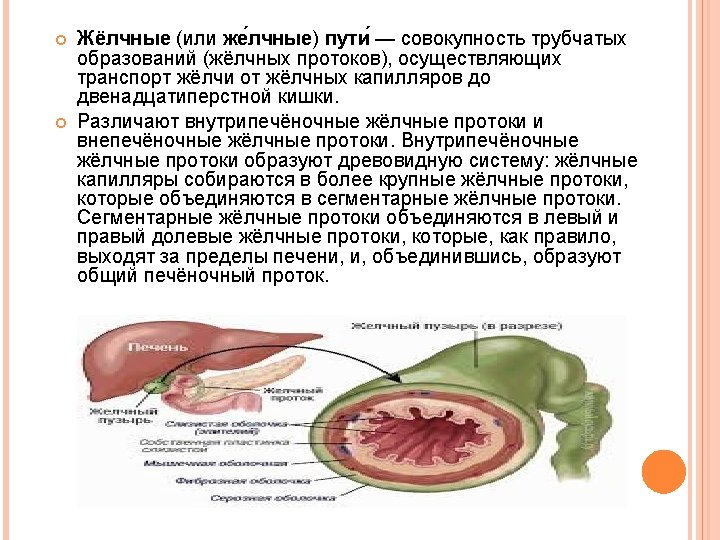 Bile (or gall) path - a set of tubular structures (bile ducts), transports bile from the bile capillaries to the duodenum. There are intrahepatic bile ducts and Extrahepatic bile ducts. Intrahepatic bile duct to form a tree-like system: bile capillaries gather in larger bile ducts, which are combined into a segmental bile ducts. Segmental bile ducts unite the left and right equity bile duct, which usually extend beyond the liver, and, together, form the common hepatic duct.