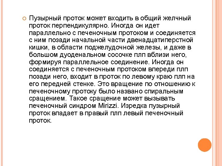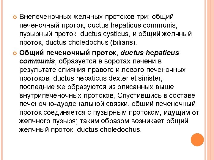 Extrahepatic bile ducts are three: the common hepatic duct, ductus hepaticus communis, cystic duct, ductus cysticus, and the common bile duct, ductus choledochus (biliaris). Common hepatic duct, ductus hepaticus communis, is formed in the gate of the liver as a result of the merger of the right and left hepatic ducts, ductus hepaticus dexter et sinister, past the same manner described above intrahepatic ducts, after a part of hepato-duodenal ligament, common hepatic duct connects with cystic duct coming from the gallbladder; thus arises the common bile duct, ductus choledochus. The cystic duct connects the gallbladder to the hepatic duct. When you merge it with the common hepatic duct forms the common bile duct. Cystic duct length of 4 -6 cm, sometimes it can reach 10 -12 cm. The flow can be short PLP completely absent. The proximal diameter is typically 2 -2. 5 mm, which is slightly less than its distal diameter, which is about 3 mm. Outside, it seems uneven and twisted, especially in the proximal half of the two-thirds of the PLP, because of the presence within the duct valves heister (Heister). Valves heister are crescent shaped and arranged in alternating sequence, which gives the impression of a continuous spiral. Actually, the valves are separated from each other. Heister valves regulate the flow of bile between the gallbladder and bile ducts. The cystic duct is usually connected to the hepatic duct at an acute angle in the upper half of the hepatic ligament, mostly on the right edge of the hepatic duct, forming a vesico-hepatic angle.