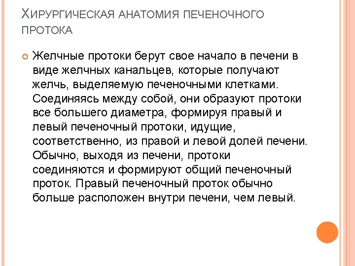 The cystic duct can enter the common bile duct perpendicularly. Sometimes it is parallel to the hepatic duct and is connected with it behind the initial portion of the duodenum, in the pancreas and even papillary PLP near it, forming a parallel connection. Sometimes it is connected to the hepatic duct in front of the PLP behind him, he enters the duct on the left side of PLP on the front wall. This rotation in relation to the hepatic duct was called spiral seam. Such fusion may cause liver syndrome Mirizzi. Occasionally the cystic duct empties into the right PLP left hepatic duct. Bile ducts originate in the liver as bile ducts and who get the bile secreted by liver cells. Interconnected, they form all channels of larger diameter forming the right and left hepatic ducts extending respectively from the right and left liver lobes. Typically, leaving the liver ducts are connected and form the common hepatic duct. Right hepatic duct is usually greater in the liver than the left.