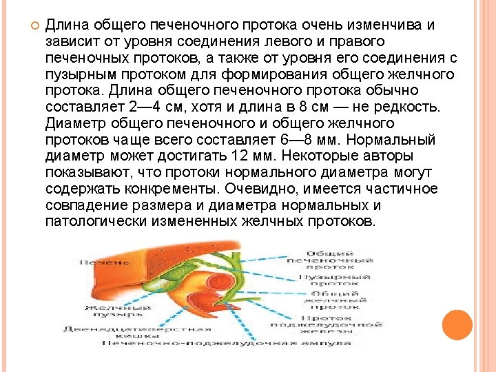 The length of the common hepatic duct is very variable and depends on the level of the compound of left and right hepatic ducts, and the level of its connection to the cystic duct to form the common bile duct. The length of the common hepatic duct is generally 2 -4 cm, although the length is 8 cm - not uncommon. The diameter of the common hepatic and common bile ducts often is 6 -8 mm. Normal diameter up to 12 mm. Some authors suggest that the normal diameter ducts may contain concretions. Obviously, there is an overlap between the size and diameter of normal and pathological changes of the bile ducts.