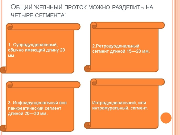 THE COMMON BILE DUCT CAN BE DIVIDED INTO FOUR SEGMENTS: 1. Supraduodenal, typically having a length of 20 mm. 3. Infra Duodenal pancreatic segment length is 20 -30 mm. 2. Retroduodenalny segment length of 15 -20 mm. 4. Intraduodenally or intramural segment.