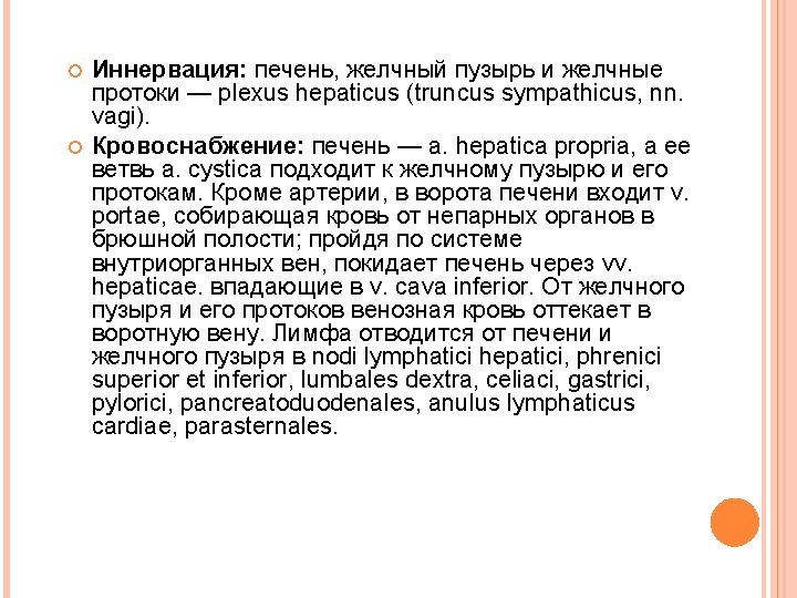 The innervation of the liver, gall bladder and bile ducts - plexus hepaticus (truncus sympathicus, nn. Vagi). Blood supply: the liver - a. hepatica propria, and its branch a. cystica coming to the gallbladder and its ducts. In addition to the artery in the liver enters the gate v. portae, blood was collected from the unpaired organs in the abdominal cavity; passing system intraorgan veins, it leaves the liver through vv. hepaticae. flowing into the v. cava inferior. From the gallbladder and its ducts venous blood flowing into the portal vein. Lymph is removed from the liver and gall bladder in nodi lymphatici hepatici, phrenici superior et inferior, lumbales dextra, celiaci, gastrici, pylorici, pancreatoduodenales, anulus lymphaticus cardiae, parasternales.