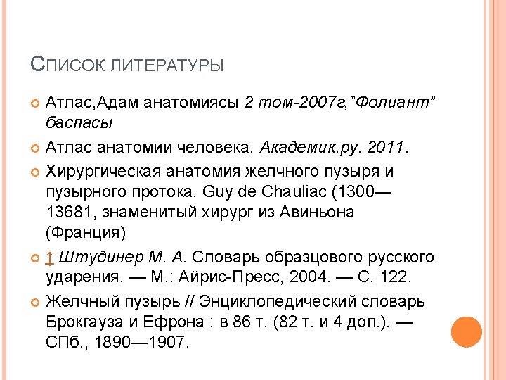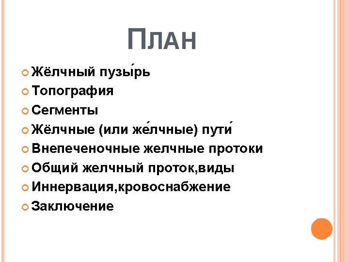 PLAN Gallbladder Topography Segments Bile (or gall) path Extrahepatic bile ducts The common bile duct, types Innervation, blood supply Conclusion