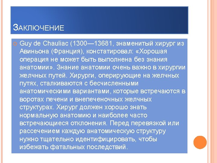 CONCLUSION Guy de Chauliac (1300 -13681, a famous surgeon from Avignon (France), stated: "The good operation can not be performed without the knowledge of anatomy. " The knowledge of anatomy is very important in biliary tract surgery. Surgeons who operate on the biliary tract, faced with countless anatomical variants that are found at the gates of the liver and extrahepatic biliary structures. The surgeon should be familiar with the normal anatomy and common deviations. Before ligation and dissection of each anatomical structure must be carefully identified to avoid fatal consequences.