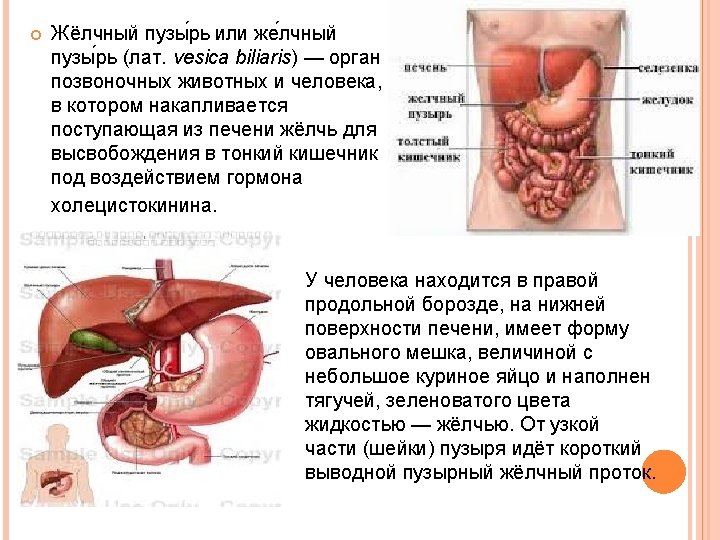Gall bladder or gall bladder (lat. Vesica biliaris) - the body of vertebrate animals and humans, which builds coming from the liver to release bile into the small intestine under the influence of the hormone cholecystokinin. The man is in the right of the longitudinal groove on the bottom surface of the liver, has an oval shape of the bag, the size of a small hen's egg and filled with viscous, greenish liquid - bile. From the narrow part (neck) there is a short leadbladder cystic bile duct. At the transition to the neck of the bladder cystic bile duct sphincter located Lyutkensa regulating the flow of bile from the gallbladder into the cystic bile duct and back. The cystic bile duct in the liver is connected to the gate of hepatic duct. Through the merger of these two ducts forms the common bile duct, and then teaming up with the main pancreatic duct and through the sphincter of Oddi, which opens into the duodenum in the major duodenal papilla.