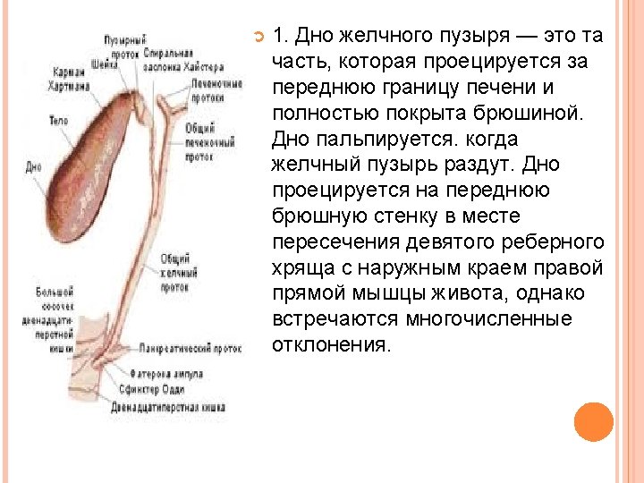 1. The bottom of the gallbladder - this is the part that is projected on the front border of the liver and is completely covered by peritoneum. Bottom palpable. when the gall bladder is inflated. The bottom is projected onto the anterior abdominal wall at the intersection of the ninth rib cartilage to the outer edge of the right rectus abdominis, but there are numerous deviations.