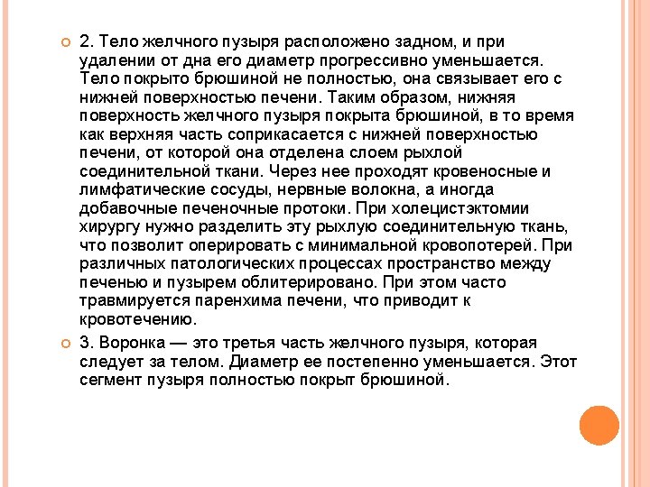 Gall bladder consists of a layer of high cylindrical epithelial cells, thin fibromuscular layer comprised of longitudinal, circular and oblique muscle fibers and fibrous tissue overlying the mucosa. The gall bladder has no submucosa and muscular-mucous membranes. It does not contain mucous glands (sometimes can present isolated mucous glands, which number increases slightly in inflammation, these mucous glands are located almost exclusively in the neck). Fibromuscular layer is covered with a layer of loose connective tissue, through which penetrate the blood, lymph vessels and nerves. To perform subserous cholecystectomy. you must find this a pad which is a continuation of the tissue that separates the gallbladder from the liver into the hepatic bed. Funnel goes into the neck length of 15 -20 mm, forming an acute angle, open up.