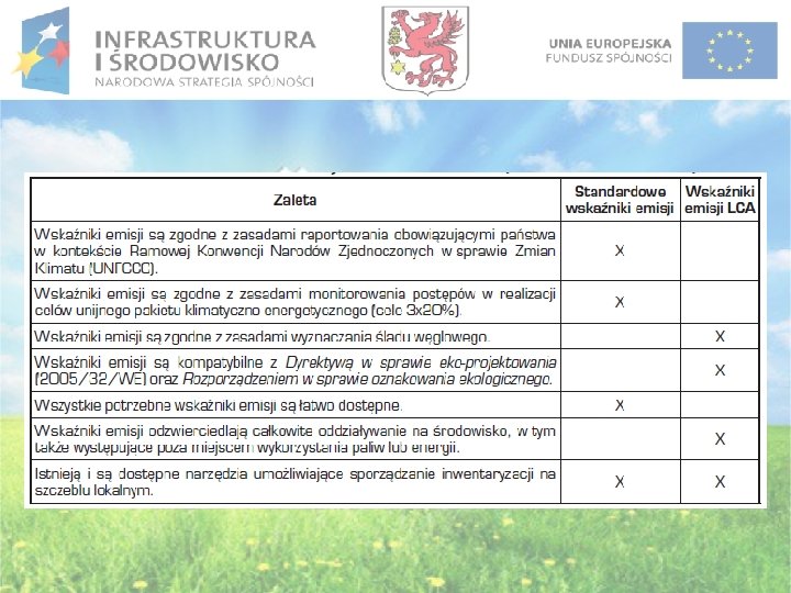 WYBÓR WSKAŹNIKÓW EMISJI ü „standardowe” wskaźniki emisji zgodne z zasadami IPCC (Międzyrządowego Zespołu ds. Zmian Klimatu), które obejmują całość emisji CO 2 wynikłej z końcowego zużycia energii na terenie miasta lub gminy – zarówno emisje bezpośrednie ze spalania paliw w budynkach, instalacjach i transporcie, jak i emisje pośrednie towarzyszące produkcji energii elektrycznej, ciepła i chłodu wykorzystywanych przez mieszkańców. Standardowe wskaźniki emisji bazują na zawartości węgla w poszczególnych paliwach i są wykorzystywane w krajowych inwentaryzacjach gazów cieplarnianych wykonywanych w kontekście Ramowej Konwencji Narodów Zjednoczonych w sprawie Zmian Klimatu oraz Protokołu z Kioto do tej konwencji. W tym przypadku najważniejszym gazem cieplarnianym jest CO 2, a emisje CH 4 i N 2 O można pominąć (nie trzeba ich wyliczać). Co więcej, emisje CO 2 powstające w wyniku spalania biomasy/biopaliw wytwarzanych w zrównoważony sposób oraz emisje związane z wykorzystaniem certyfikowanej zielonej energii elektrycznej są traktowane jako zerowe.