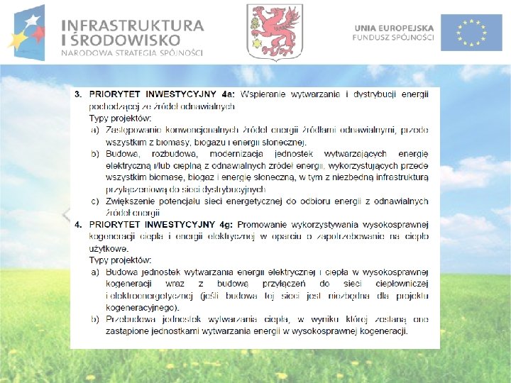 FINANSOWANIE DZIAŁAŃ NISKOEMISYJNYCH 1. NFOŚi. GW i WFOŚi. GW: • BOCIAN - celem programu jest ograniczenie lub uniknięcie emisji CO 2 poprzez zwiększenie produkcji energii z instalacji wykorzystujących odnawialne źródła energii. Beneficjentami są przedsiębiorcy podejmujący realizację inwestycji z zakresu odnawialnych źródeł energii; • KAWKA - likwidacja niskiej emisji wspierająca wzrost efektywności energetycznej i rozwój rozproszonych odnawialnych źródeł energii. • PROSUMENT - linia dofinansowania z przeznaczeniem na zakup i montaż mikroinstalacji odnawialnych źródeł energii. Dofinansowanie przedsięwzięć obejmie zakup i montaż nowych instalacji i mikroinstalacji odnawialnych źródeł energii do produkcji: energii elektrycznej lub ciepła i energii elektrycznej (połączone w jedną instalację lub oddzielne instalacje w budynku), dla potrzeb budynków mieszkalnych jednorodzinnych lub wielorodzinnych, w tym dla wymiany istniejących instalacji na bardziej efektywne i przyjazne środowisku. Beneficjentami programu będą osoby fizyczne, spółdzielnie mieszkaniowe, wspólnoty mieszkaniowe oraz jednostki samorządu terytorialnego i ich związki. • SOWA – Energooszczędne oświetlenie uliczne - celem programu jest wspieranie realizacji przedsięwzięć poprawiających efektywność energetyczną systemów oświetlenia ulicznego.