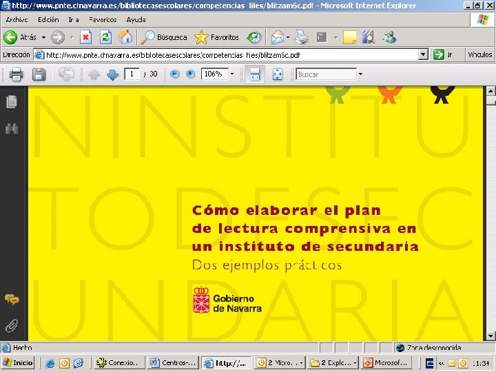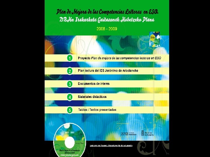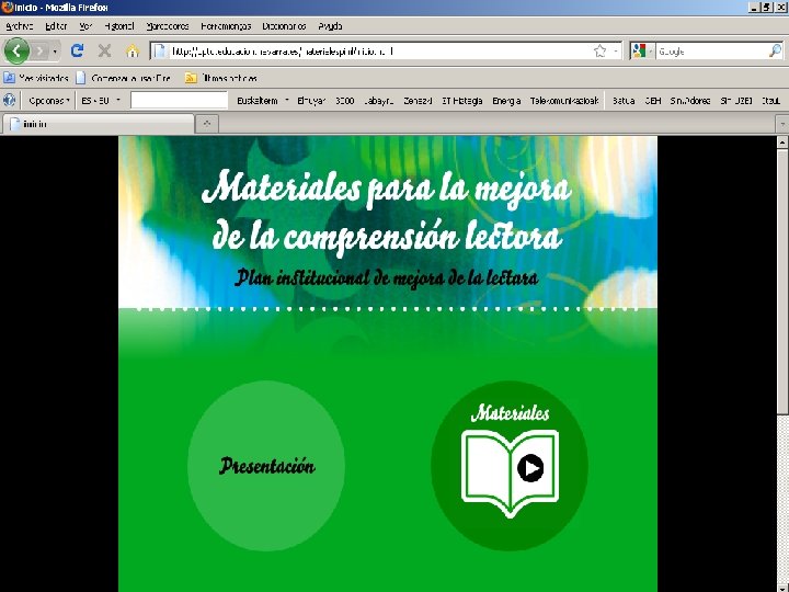 MATERIALES 2008 -2010 PUBLICACIÓN DE MATERIALES PARA TRABAJAR LA COMPRENSIÓN LECTORA EN EL AULA 1. TEXTOS + ESTRATEGIAS 2. TEXTOS + PROCESOS 3. TEXTOS + ESTRATEGIAS Y PROCESOS “Materiales para la mejora de la comprensión lectora” DIRECCIÓN: http: //dpto. educacion. navarra. es/materialespiml/inicio. html