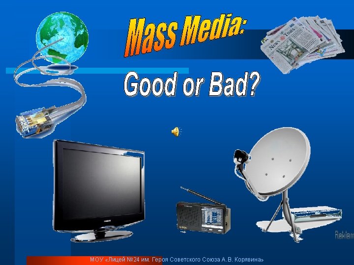 The aims 1. To tell about different kinds of Mass Media. 2. To show the advantages and disadvantages of different Mass Media. 3. To make all teenagers believe that the media brings people closer to each other. 4. To show the difference of Press in Russia and in the UK. МОУ"Лицей № 24 им. Героя Советского Союза А. В. Корявина"