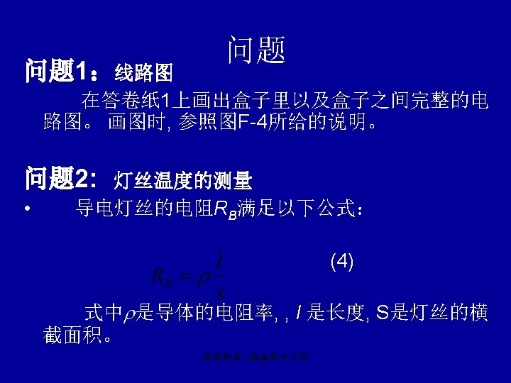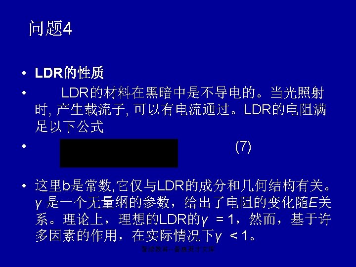 问题 4 V /V I / m. A 9. 48 9. 73 9. 83 100. 1 10. 25 10. 41 10. 61 10. 72 10. 82 10. 97 11. 03 11. 27 11. 42 11. 50 85. 5 86. 8 87. 3 88. 2 89. 4 90. 2 91. 8 92. 2 93. 0 93. 3 94. 5 95. 1 95. 5 R /k 8. 77 8. 11 7. 90 7. 49 7. 00 6. 67 6. 35 6. 16 6. 01 5. 77 5. 69 5. 35 5. 17 5. 07 For working out we know that: R R = 5. 07 0. 01 k R’ = 8. 11 0. 01 k 透光率 t = 51. 2 % 智浪教育--普惠英才文库