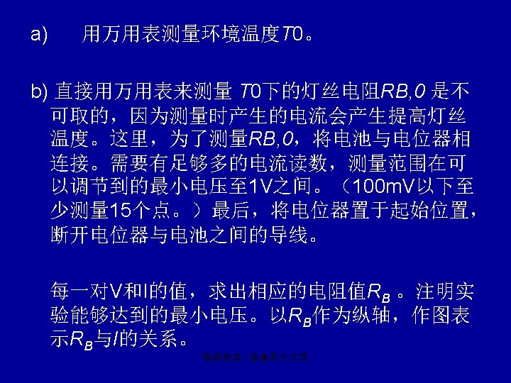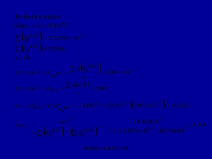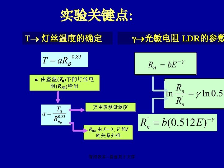 数据的测量 R V A I V RB=V/I T = a. RB 0. 83 RB-0. 83 R ln. R I 1 V 1 RB 1 T 1 RB 1 -0. 83 R 1 ln. R 1 I 2 V 2 RB 2 T 2 RB 2 -0. 83 R 2 ln. R 2 I 3 V 3 RB 3 T 3 RB 3 -0. 83 R 3 ln. R 3 In Vn RBn Tn RBn-0. 83 Rn ln. R 智浪教育--普惠英才文库 RB-0. 83