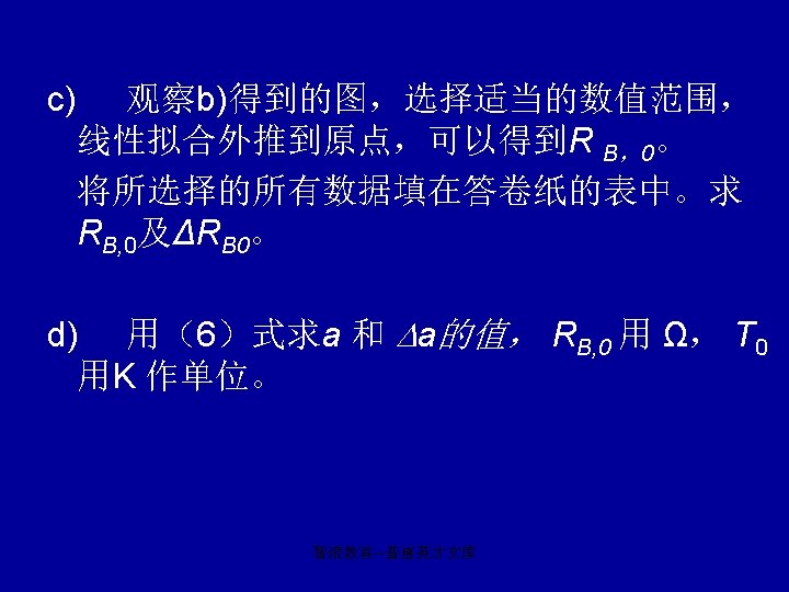Column and values for 1/T missing. -1. 50 pt Column and values for ln R missing. -1. 50 pt Values of T or 1/T inconsistent with equation (6). -0. 50 pt d) 3. 00 pt ln. R computation is incorrect. For each column with incorrect number of digits. Fit made with less than 12 points. 智浪教育--普惠英才文库 -0. 50 pt -0. 20 pt -0. 30 pt