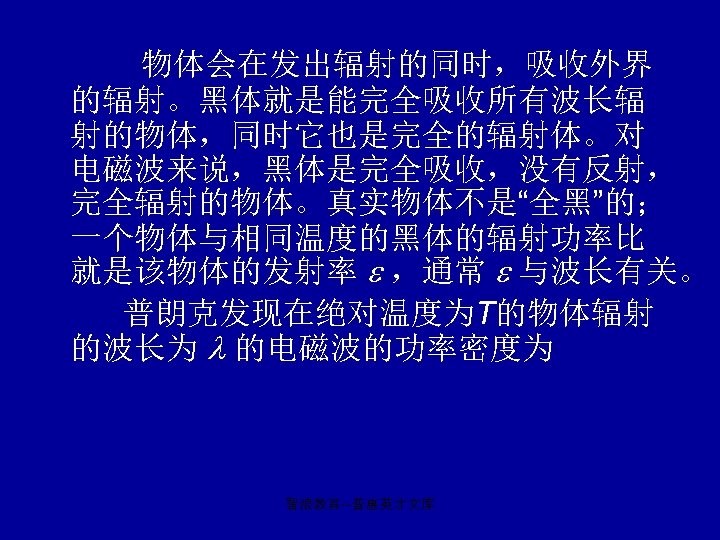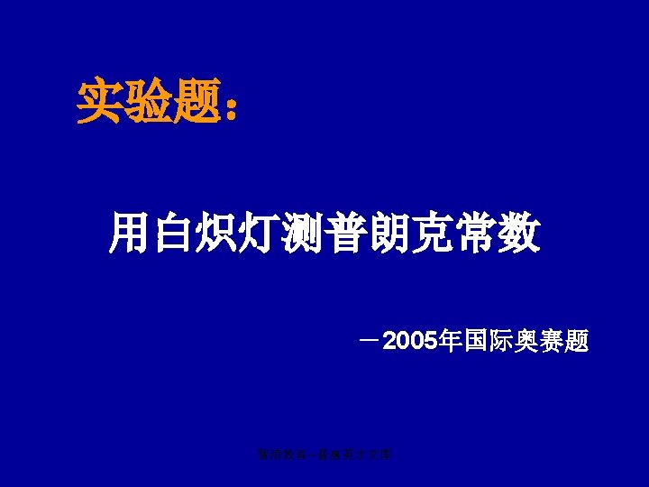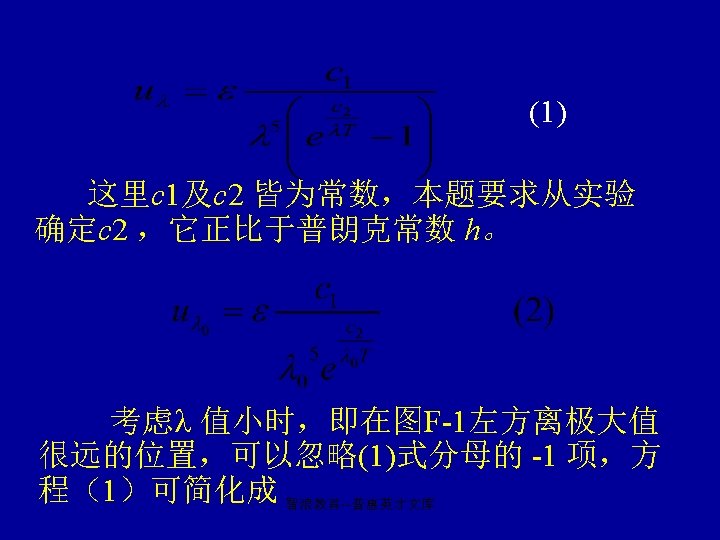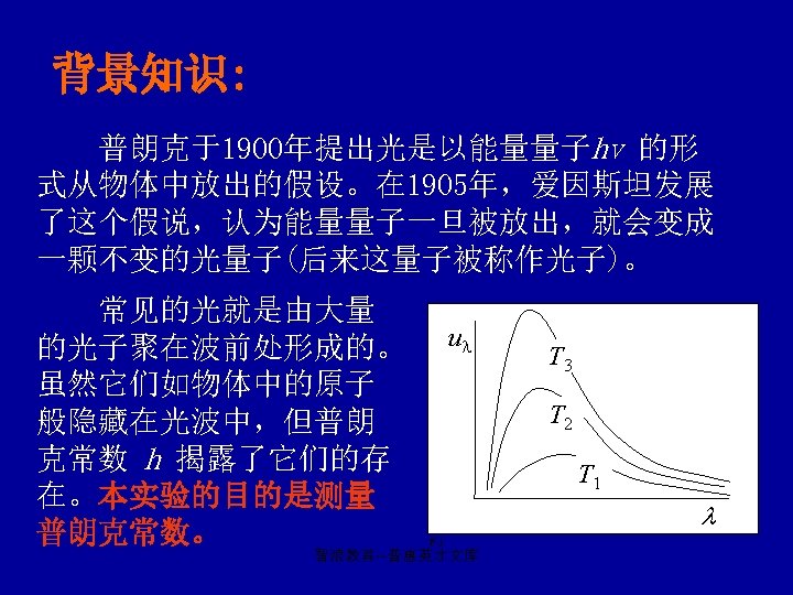 Planck 辐射定律 波长为 的单位时间的辐射能 Where c 2=hc/k h: Planck’s constant c: velocity of light k: Boltzmann’s constant 本实验的主要 目的 智浪教育--普惠英才文库