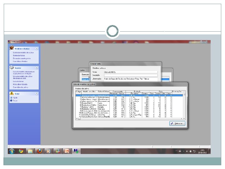 Ferramentas de Auxilio �Horta Fácil: �Programa computacional desenvolvido por pesquisadores de instituições de ensino e de pesquisa publicas e privadas : UNIFENAS ( Professor Ernani C. da Silva), UFLA (Wilson R. Maluf e Luiz A. A. Gomes) , UFM (Thiago V. Conrado). � O Horta Fácil é um software de uso gratuito e distribuição irrestrita. Nele você poderá obter facilmente a dimensão de cada área a ser plantada semanalmente para se obter uma produção contínua de diversas hortaliças com entregas semanais constantes sem o desperdício de área ou produção.