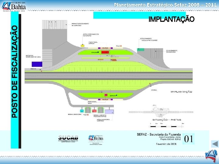 Programa: Aprimoramento da Fiscalização – Trânsito de Mercadorias • Implantação do Posto Fiscal Virtual • Implantação de câmaras, cancelas eletrônicas, balanças dinâmicas nos postos fiscais; • Capacitação do pessoal; • Operações de impacto: Mimoso do Oeste, Blitzs Ceasa etc. • Construção do Posto Fiscal Bahia - Goiás