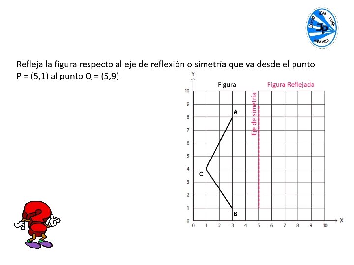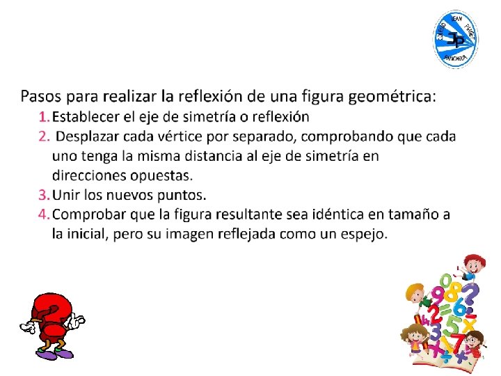 ¿Qué es la Reflexión? La reflexión es la simetría respecto de un eje llamado eje de reflexión, se caracteriza por que los puntos simétricos de una figura y los de la figura reflejada están a la misma distancia del eje de simetría, pero en direcciones opuestas. La figura reflejada siempre tiene el mismo tamaño que la original, pero vista a través de un espejo. Llamaremos reflejo o imagen al resultado de reflexión de una figura.