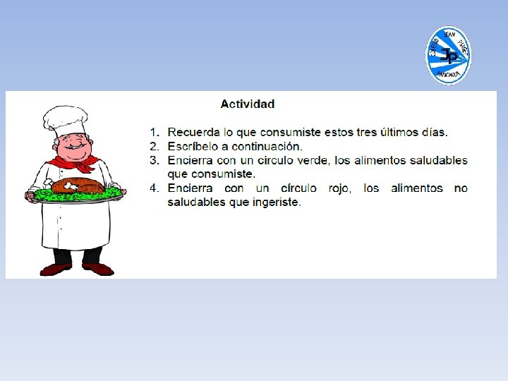 Activando nuestros conocimientos previos Para comenzar la clase y activar tus conocimientos, responde en forma oral, las siguientes preguntas: • ¿Crees que la alimentación es importante para nosotros? ¿En qué sentido? • ¿Qué pasa cuando me alimento mal? • ¿Te gusta la comida chatarra? ¿Por qué? • ¿Conoces alguna enfermedad relacionada con la alimentación?