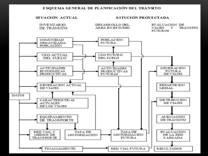 • En suma, en la planificación del tránsito y del transporte se contemplan los factores que afectan aquel equilibrio, tanto en condiciones actuales como futuras, considerando básicamente la interrelaci 6 n de los elementos del sistema de tránsito: • USUARIO - VEHÍCULO - ARTERIA - MEDIOS DE CONTROL • cuyo valor reside, por otra parte, en la interrelaci 6 n entre factores tales como los viajes, el uso del suelo, la red vial, la población, etc. , y en la integración de diversas disciplinas, en el empleo de modelos matemáticos y uso de los procesos de la computación.