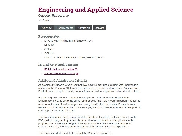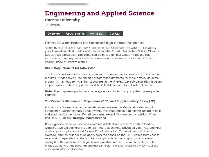 Timelines for University Applications • January 15 deadline to complete online application • February 5 recommended last date for university or program changes & additions • May 29 latest date students can expect a response from an Ontario university • June 1 earliest date Ontario universities may require a response to an offer of admission from students • Universities outside of Ontario will have their own timelines and application process. Many universities are connected to the OUAC eg Mc. Gill, Dalhousie