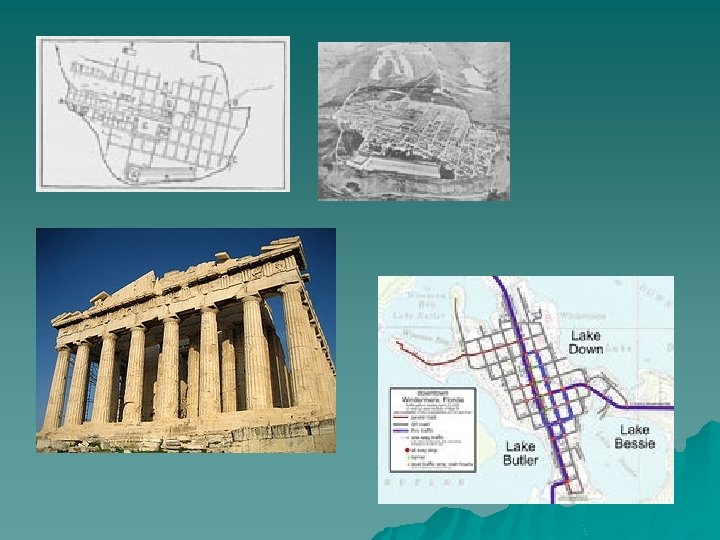 Greece Miletus – 600 BC Planned by Hippodamus 3 parts by 3 parts Grid Pattern flexibility and ease of grid plan Plan adapted and used extensively by Alexander 325 Bcto develop new cities Organized around the agora, theater, temples Plan of Miletus by Hippodamus