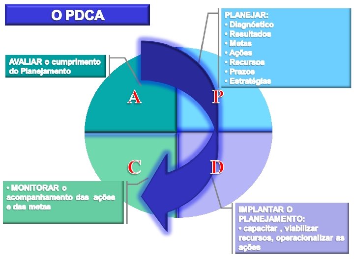 O PDCA Compõe-se de um conjunto de ações numa seqüência dada pela ordem estabelecida pelas letras que compõem a sigla: • P - plan: planejar • D - do: fazer, executar • C - check: verificar, controlar • A - act: agir, atuar corretivamente