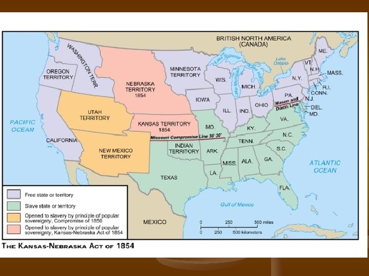 Kansas-Nebraska Act n n Introduced by Stephen Douglas in 1854 Repealing the Missouri Compromise Organized Kansas and Nebraska territories and allowed the people to determine the issue of slavery (popular sovereignty) Pro-slavery and anti-slavery patrons crossed into these territories to cast ballots (in order to sway the vote - fraudulent victory leads to violent struggle over slavery in Kansas)