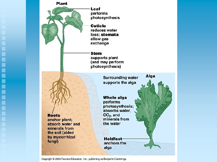 Some differences: n Green algae needs water constantly for photosynthesis & reproduction n Have no structures to prevent drying out What characteristics allow land plants to over come these obstacles?