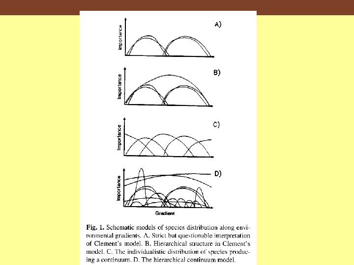 Hierarchical Continuum Model ØSpecies change their distribution and abundance patterns along gradients in response to environmental fluctuations ØSpecies with similar niches increase their competitive ability over time (theory of competitive combining ability) Øpositive correlation between the rank abundance of a species at a small spatial scale and its rank abundance at a larger spatial scale Ødistribution of species across sites in a region will be polymodal, which reflects hierarchical structure, and that the distribution and abundance of species within and between sites will be spatially and temporally dynamic Collins et al. 1993
