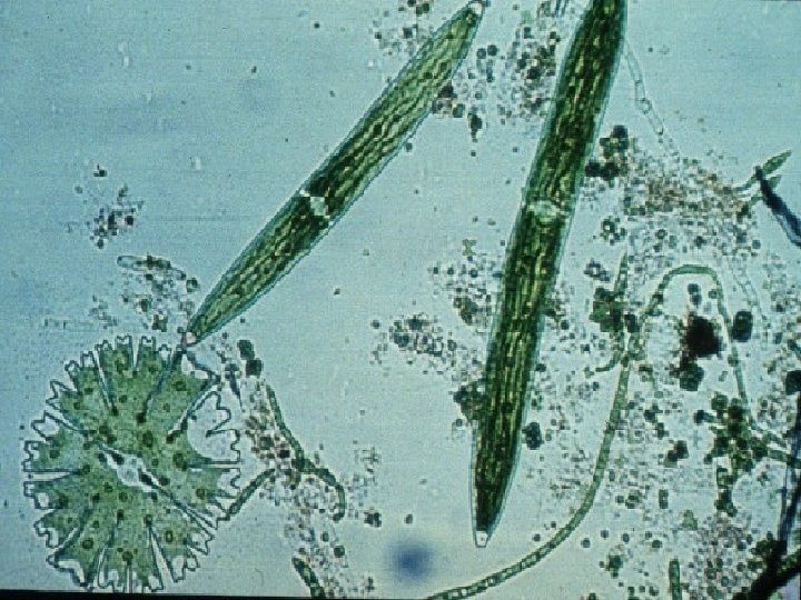 Green Algae z. Contains many morphological types z. Abundant and diverse in fresh water z. Play a significant role in aquatic food chains z. Seasonal blooms of green algae are often noticeable in ponds and lakes z. Gave rise to the land plants over 400 million yrs ago