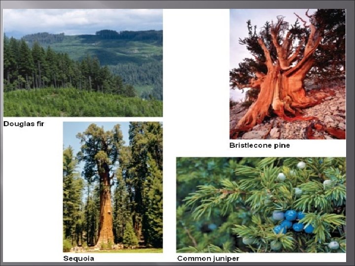 Coniferophyta: Largest group of gymnosperms Most are evergreen Make up large forests in Northern hemisphere at high latitudes and altitude. Includes the pines, firs, spruces, and redwoods.