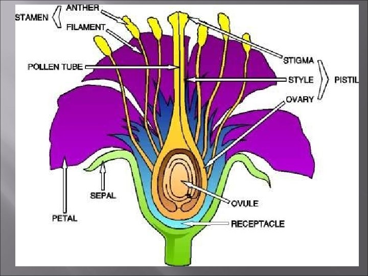 Major Reproductive Adaptation of Angiosperms is the Flower consists of four floral organs: Sepals - protect the flower before emergence Petals - attract pollinators Stamens - male reproductive structure produces microspores in the anthers that develop into pollen grains. Carpels - the female reproductive structure produces megaspores and their products: female gametophytes with eggs.