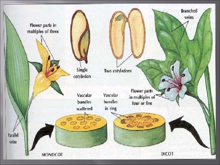 Angiosperms are divided into Moncots and Eudicots (dicots) Monocots have: One cotyledon in the seed Parallel leaf veination Flowering parts in multiples of threes Vascular bundles are scattered through out the stem.