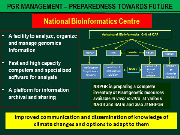 Plant Genetic Resources Management System NBPGR (The Nodal Institute) Second largest base collection in NGB (~0. 4 m accessions of over 1300 crop species) NETWORK NBPGR and its 10 Regional Stations 59 National Active Germplasm Sites (NAGS) comprising ICAR Institutes, Project Directorates, NRCs, AICRPs, SAUs COLLABORATORS Internationa l Collaborato rs Other National Stakeholder s