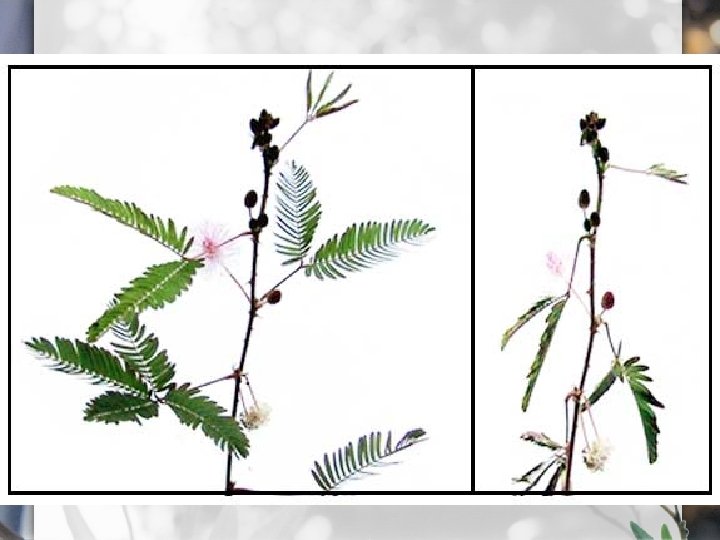 Turgor Movements • The sensitive plant folds its leaves and droops in response to touch • How? – When touched an electrical impulse moves down the leaf to cells called the pulvinus at the end of the petiole – A pulvinus is a swollen joint that acts as a hinge – When the signal reaches the pulvinus, it induces a chemical signal that increases membrane permeability to certain ions – As potassium ions exit the permeable membrane, it causes water to leave too through osmosis. They plant loses its rigidity or turgor