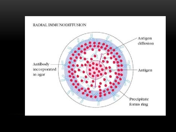 IMMUNODIFFUSION TECHNIQUES • Radial Immunodiffusion - A single diffusion technique where Ab is put into gel and Ag is measured by the size of a precipitin ring formed when it diffused out in all directions from a well cut into the gel. • Ouchterlony Double Diffusion - Both Ab and Ag diffuse from wells into a gel medium.