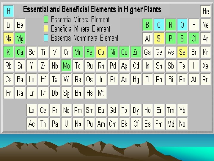 Beneficial elements as essential elements • Sodium: there are 3 indicators of Na i) Kochia indica ii) Suaeda iii) Salsola • Nickel: Ni is essential in some plants e. g. in Jack bean (this plant cannot complete life cycle without Ni) • Silicon: Si is essential in some monocots e. g. grasses. In these plants Si is deposited around cell wall so they are more resistant to environmental stresses than the dicots. In rice 16. 4% is deposited in its cell wall.