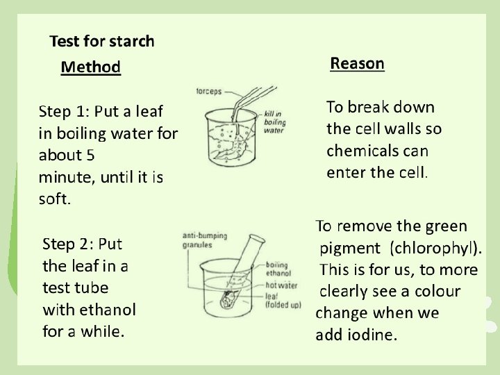 Success criteria • Investigates to find out that light, chlorophyll and carbon dioxide are necessary for photosynthesis. • Experiments to show that oxygen is released during photosynthesis. • Appreciates plants as environment purifier (uses carbon dioxide and • releases oxygen during day time). • Appreciates the creations of Allah for such blessings.