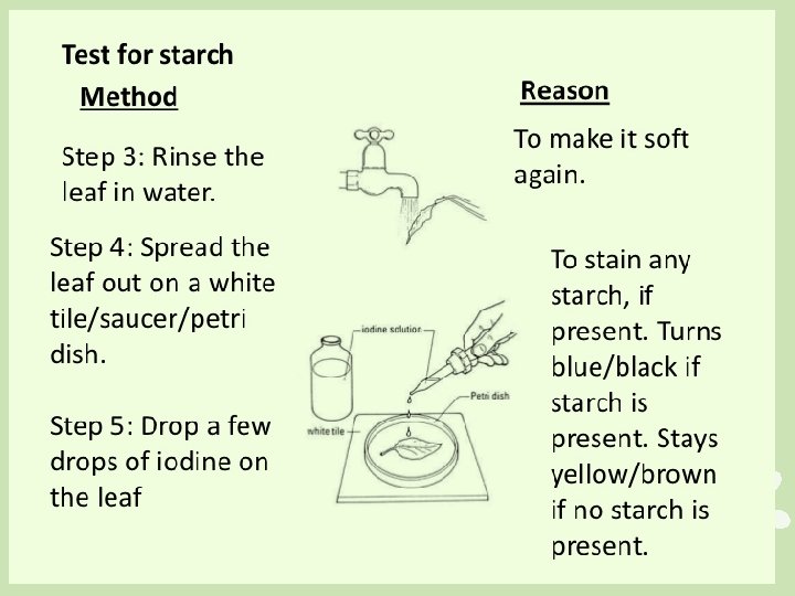 What happens to the glucose (sugar) that is made during photosynthesis? • As previously said, glucose(sugar) is made during photosynthesis. • The plant uses it for it’s own life processes. • The phloem transports it through the plant. • Excess glucose is binded together to form starch. • The starch is stored in the plant, mainly by the roots. • Starch in a photosynthesising plant can already be detected in the leaves