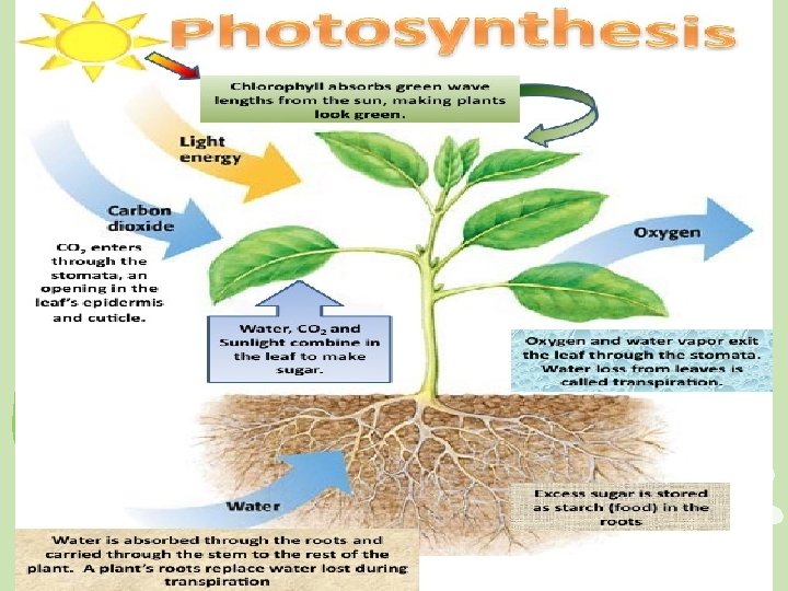 Factors necessary for photosynthesis • Carbon dioxide from the air diffuses into the leaf through stomata. • The water and minerals are absorbed by roots and transported to other parts of the plant through the vessels in stem. • Sunlight provides energy to produce food. • Chloroplasts is the site of photosynthesis. It contain the green coloured pigment chlorophyll which absorb the maximum amount of sunlight.