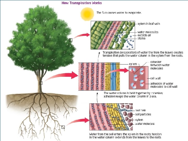 Root pressure is not enough to make water go up Plants need pull from above This is called Transpiration -release water from leaves (stoma) Water Cohesion- water sticks together Adhesion- water sticks to other “stuff” (xylem)