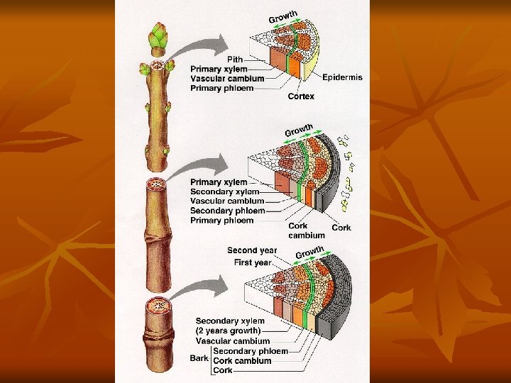 Lateral Growth n n Lateral Meristems also called vascular cambium – forms between xylem and phloem so there is a continuous cylinder around xylem and interior ground tissue It forms 2 ndary xylem on the inside and 2 ndary phloem on the outside