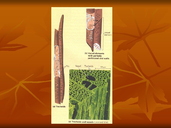 III. Long Distance Transport (vertical movement thru xylem and phloem – diffusion is too slow A. Xylem (tracheids and vessel elements with 2 set of cells walls) - schlerenchyma ↑ ↑ Tracheids ↑ Vessel Element