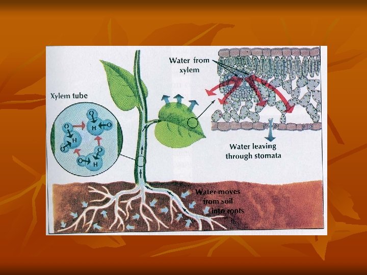 Xylem continued n Xylem has two methods of movement: n n Main method is transpiration accompanied by cohesion and adhesion (transpiration caused by lower water potential in air than in mesophyll of leaf) Second method that helps some is root pressure. Minerals are actively transported into the xylem in the root which decreases water potential in the xylem cells, water flows in and pushes the water up (only good for a few meters)