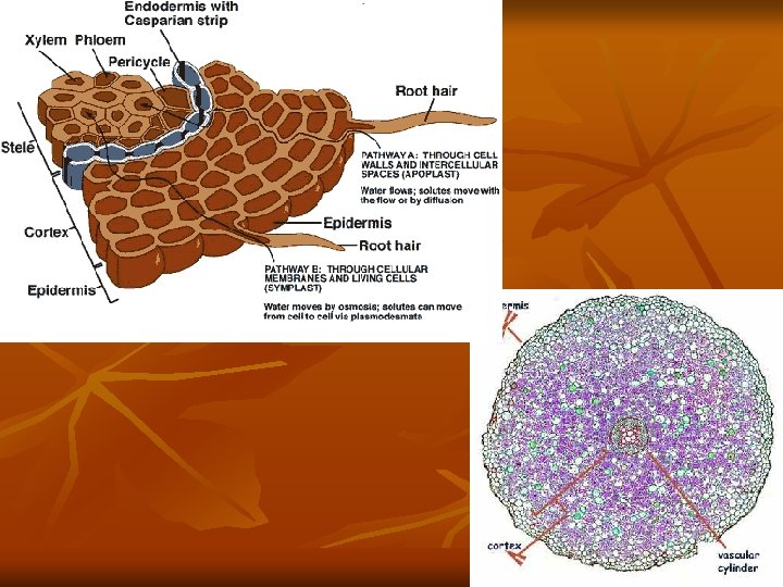 Xylem Continued n n Water and mineral transported from roots to leaves To get into the xylem – things pass from the epidermis of the roots into the cortex and into the steele which then branches into the xylem in the stem In roots, root hairs increase surface area to absorb more thru the epidermis Endodermis (between cortex and steele) is selective in what mineral can cross into the steele
