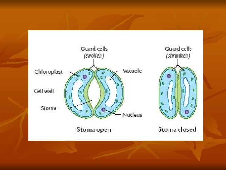 Xylem continued n Regulation of Transpiration controls the flow of water thru the plant and also makes sure that the plant doesn’t dry out and have no water for photosynthesis n n n Guard cells buckle outward when full of water Guard cells flap closed when empty (when water is lacking, turgor pressure decreases and the cells become flaccid and flop together Also, guard cells use chemiosmosis to open and close n n They pump H+ out which causes a neg. charge inside that caused K+ to be drawn into the cell Due to the K+ in the cell – it become hypertonic and water flows in The active pumping is stimulated by light and low CO 2 For closing, K+ is transported out in response to high temp or high CO 2 (mediated by abscisic acid- a hormone)