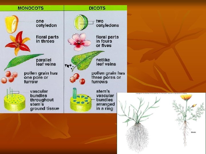 Monocots vs. Dicots n n Grass, wheat, corn , rice, sugar cane Fibrous roots Parallel veins Flowers in 3’s n n n Most others Tap Roots Net-like veins Flowers in 4’s and 5’s Can become woody