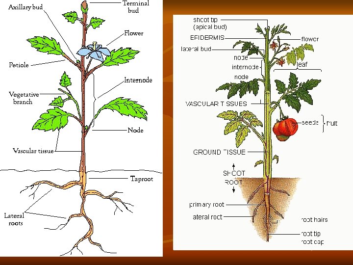 Root vs. Shoot System n n n Root system (roots) Takes water and minerals from the soil (absorbs from the tips n n of the roots and root hairs increase surface area from absorption) n Anatomy: n n n Tap roots (dicots) – a large vertical root with smaller lateral roots (store food) Fibrous roots (monocots) – matlike roots that spread Shoot system (stem, leaves, flowers) Takes CO 2 from the air, make sugar, plant reproduction Transports sugar to the rest of the plant Anatomy n Stems: n n Nodes – where leaves attach Buds – create more shoots n n Terminal buds – end of stem – cause apical dominance – inhibits side growth Axillary buds – side bud. S Leaves: Petiole – attaches leaf to the node (not in monocots – leaf ensheathed in stem) Flowers – modified leaves with stem specialized for reproduction