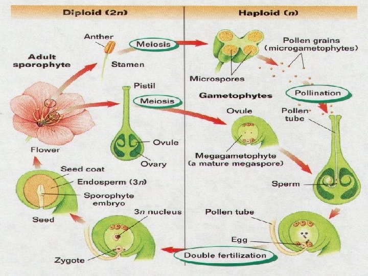Don’t forget that all plants undergo “alternation of generations” in their cycle of existance. Each generation alternates between the diploid sporophyte and the haploid gametophyte.